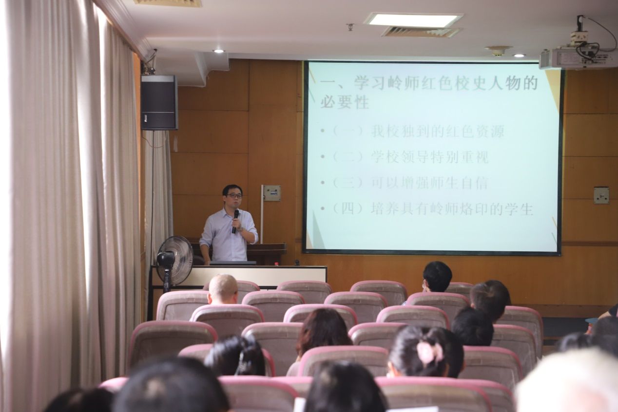 夏松涛的宣讲围绕学习岭师红色校史人物的必要性、红色校史人物的先进事迹、精神品质、学习红色校史人物的提议与建议等四个方面展开。其中重点介绍了黄学增、谭平山等六位革命先辈的先进事迹,讲解了他们高尚的精神品质,并号召大家向革命先辈学习,坚定自己的革命信仰,培养强烈的爱国主义,不畏强暴,主动学习。除了介绍惊心动魄的革命史外,夏松涛还提到了革命先辈一些有趣的生活细节,与会者不时发出会心一笑,讲座气氛轻松而热烈,收到了良好的效果。