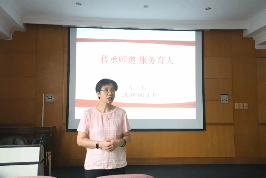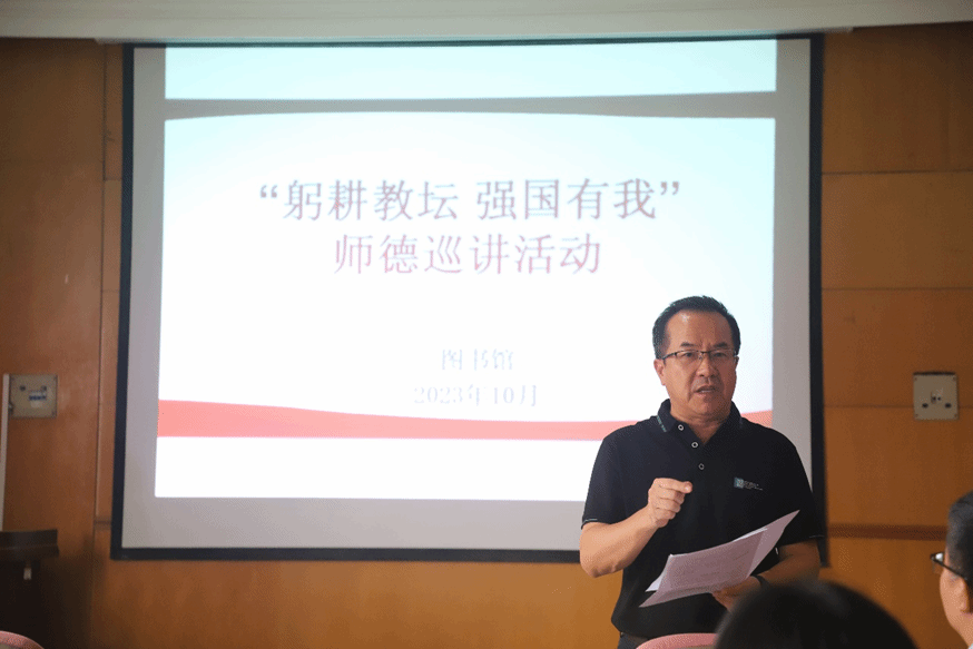 左兵馆长为全馆人员作主题为“传承师道,服务育人”的师德宣讲,结合图书馆工作实际,要求全体馆员加强学习,增长教师传道授业解惑的本领,争做“四有”好老师,向“大先生”目标努力,勇担强国建设使命。勉励大家要有甘为绿叶、默默奉献的精神和敬业爱岗、忠于职守的责任,要本着“读者第一,服务至上”的原则,增强服务育人的意识和自觉性,使全馆的师德建设水平全面提高,进一步提高服务水平和服务质量,以实干担当履职尽责,在平凡岗位上创造不平凡的业绩。